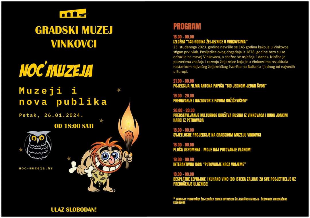 Ove godine glavna tema Noći muzeja u Gradskom muzeju Vinkovci vezana je uz izložbu ”145 godina željeznice u Vinkovcima” koja se realizira uz suradnju s Hrvatskim željezničkim muzejem i koja obilježava ovaj vrlo važan jubileja, a odvija se i u Vinkovačkoj željezničkoj zbirci Hrvatskog željezničkog muzeja. Osim toga tu je i projekcija dokumentarnog filma Bio jednom jedan čvor uz koju će autor Anton Papić donirati željezničarsku centralu GMVk, kao i prilika da se posjetitelji prisjete svojih putovanja vlakom. U etnološlom postavu Kulturno društvo Rusina Vinkovci i KUD Joakim Hardi iz Petrovaca predstaviti će rusinske pjesme i plesove, a posjetitelji će moći obići muzej igrajući interaktivnu igru u aplikaciji Naratour.