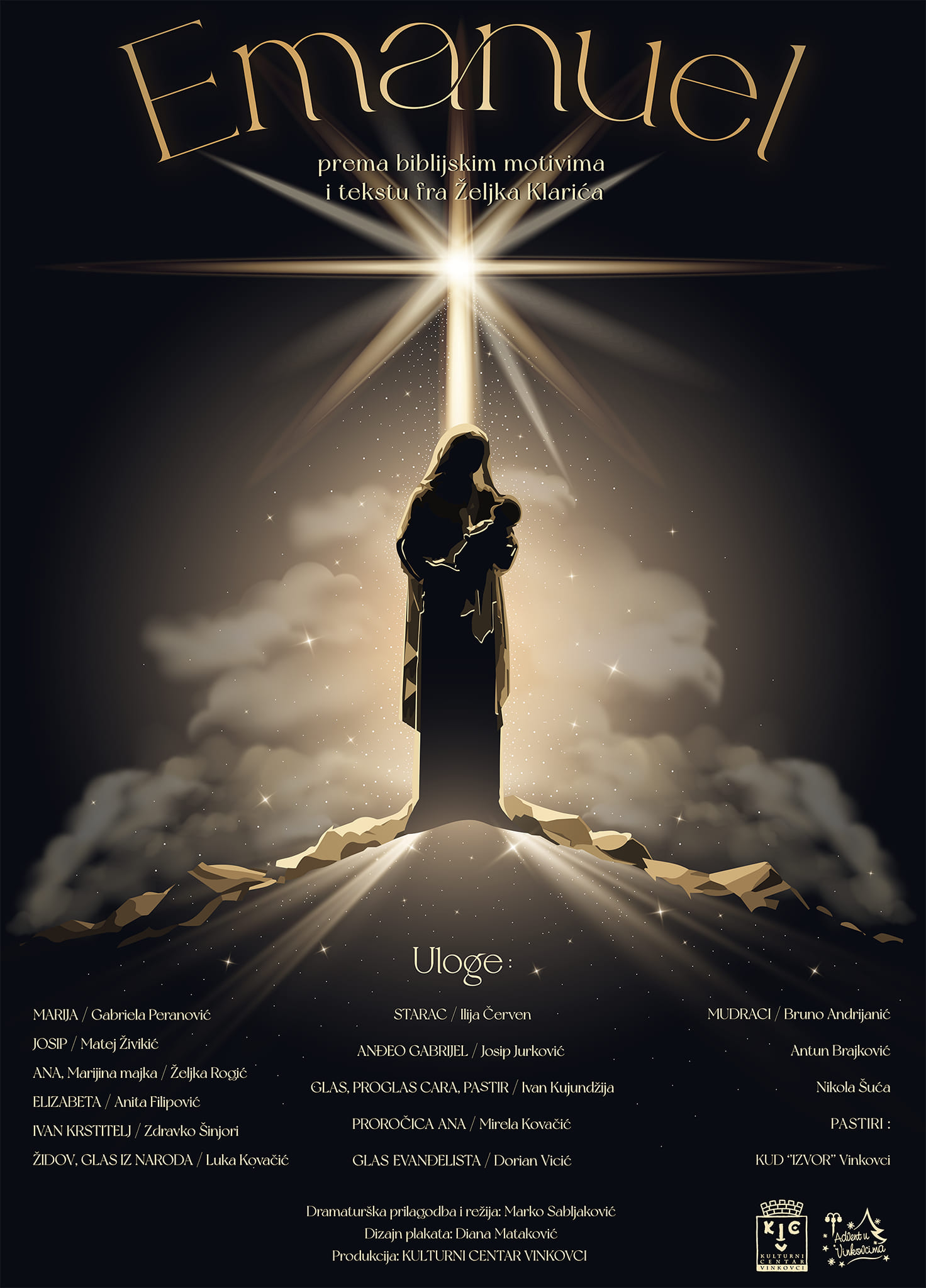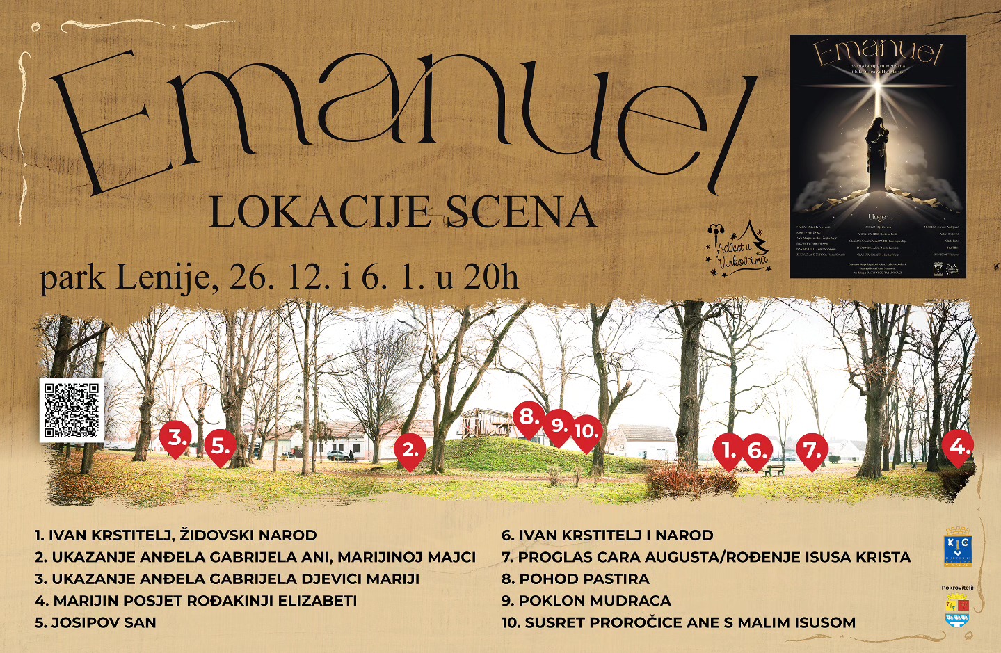 Nezaboravna i jedinstvena ambijentalna predstava nazvana EMANUEL (biblijsko je to ime, hebrejskog porijekla, izvedeno od riječi Immanuel što znači “Bog je s nama”, a značenje imena bi bilo “onaj koji je dar od Boga”, “Božji sluga ili izaslanik”) vjerodostojan je i autentičan prikaz rođenja Isusa Krista u Betlehemu. Dramaturška prilagodba nastala je prema biblijskim motivima i tekstu fra Željka Klarića, a potpisuje ju Marko Sabljaković, ujedno i redatelj predstave. Slavonski glumci, već dobro poznata lica vukovarsko-srijemske kazališne scene: Gabriela Peranović, Matej Živikić, Željka Rogić, Anita Filipović, Zdravko Šinjori, Luka Kovačić, Ilija Červen, Josip Jurković, Ivan Kujundžija, Mirela Kovačić, Bruno Andrijanić, Antun Brajković i Nikola Šuća uz studenta glume i lutkarstva osječke Akademije za umjetnost i kulturu Doriana Vicića koji je posudio glas utjelovljujući Evanđelista/pripovjedača, u vinkovačkom parku Lenije pružit će gledateljima nezaboravan doživljaj kroz igrane scene snažnih emocija i uvjerljivosti. Od trenutka začeća Marijine majke Ane, pa do ukazanja anđela Gabrijela Mariji, predstava je prožeta i onim što će tek predstojiti u kasnijim godinama Isusova života, odnosno u prikazu života i djela Ivana Krstitelja. Najradosniji betlehemski događaj – Isusovo rođenje i blagoslov Marije i Josipa u skromnoj štalici, vijest je koja će odjeknuti dolinom pastira koje će utjeloviti brojni članovi KUD-a “Izvor” iz Vinkovaca. Oni će predstavu upotpuniti izvrsnim glazbenim dionicima između igranih dramskih scena i to izvedbama tradicionalnih božićnih pjesama Slavonije i Baranje, neke pomalo i zaboravljene ili danas rijetko izvođene. Betlehemski događaj pastira okupljenih oko vatri upotpunit će i životinje poput ovaca, magarca i konja. Dojam će izazvati i autorska glazba proizašla iz radionice Vinkovčanina Luke Senčića, profesora u Glazbenoj školi Vinkovci kao i svjetlosni efekti te raskošna scenografija koju potpisuje Krešimir Bošnjak. Predstava Emanuel obiteljski je događaj u nastojanju postati tradicionalnom ambijentalno-kazališnom i turističkom atrakcijom tijekom božićnih blagdan