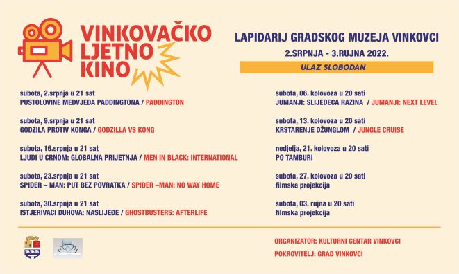 U subotu, 2. srpnja očekuje vas Vinkovačko ljetno kino. Projekcije filmova na otvorenom bit će održane u prostoru dvorišta, odnosno lapidarija Gradskog muzeja Vinkovci s početkom u 21 sat, a u slučaju kiše i lošeg vremena program seli u prostor Meraje.