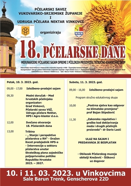 10. i 11. ožujka 2023. godine organiziraju 18. Pčelarske dane – Međunarodni pčelarski sajam opreme,