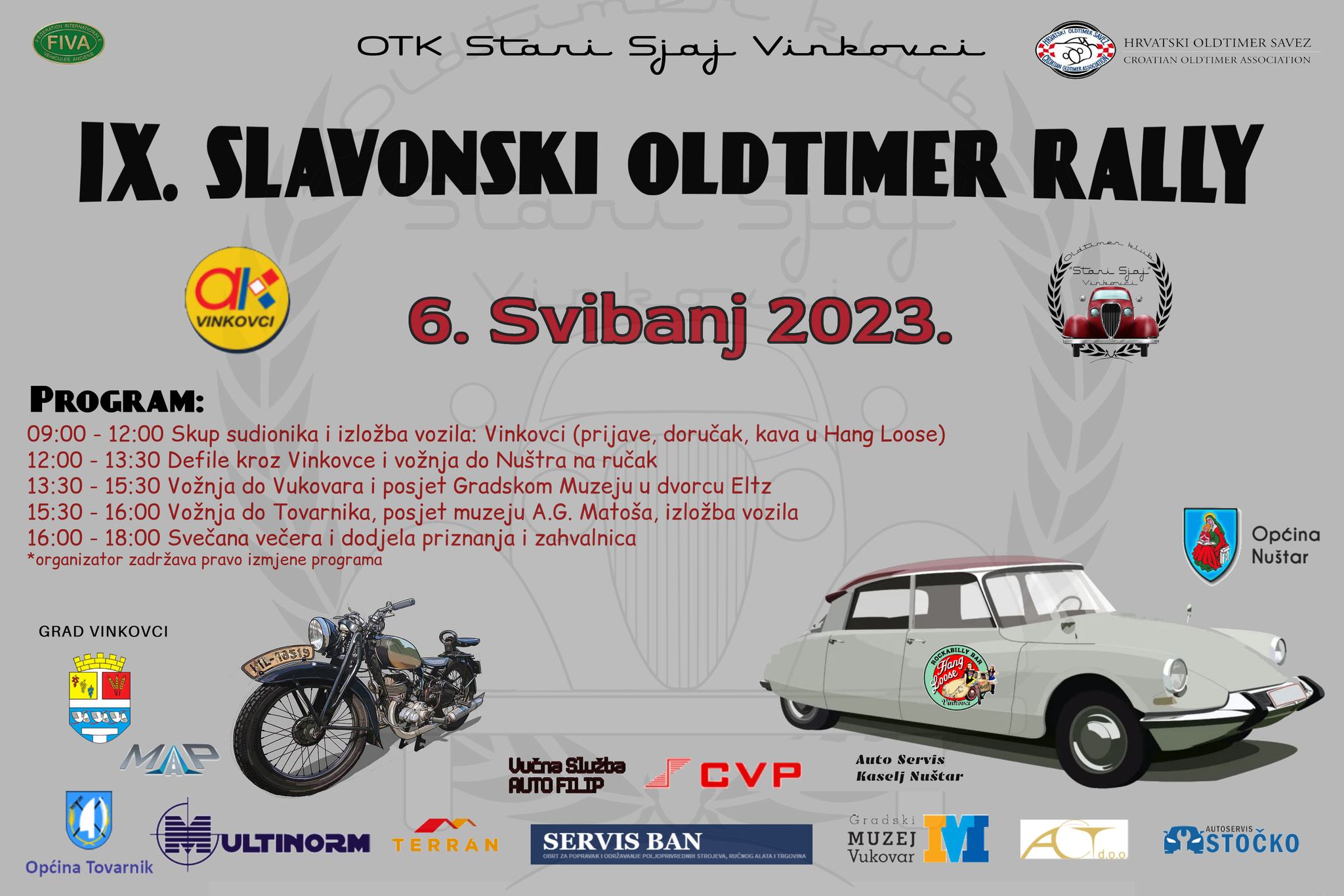 Slavonski Oldtimer Rally održati će se u subotu 6. Svibnja 2023. godine. Start iz centra Vinkovaca sve do Tovarnika sa stajanjima u Nuštru i Vukovaru.