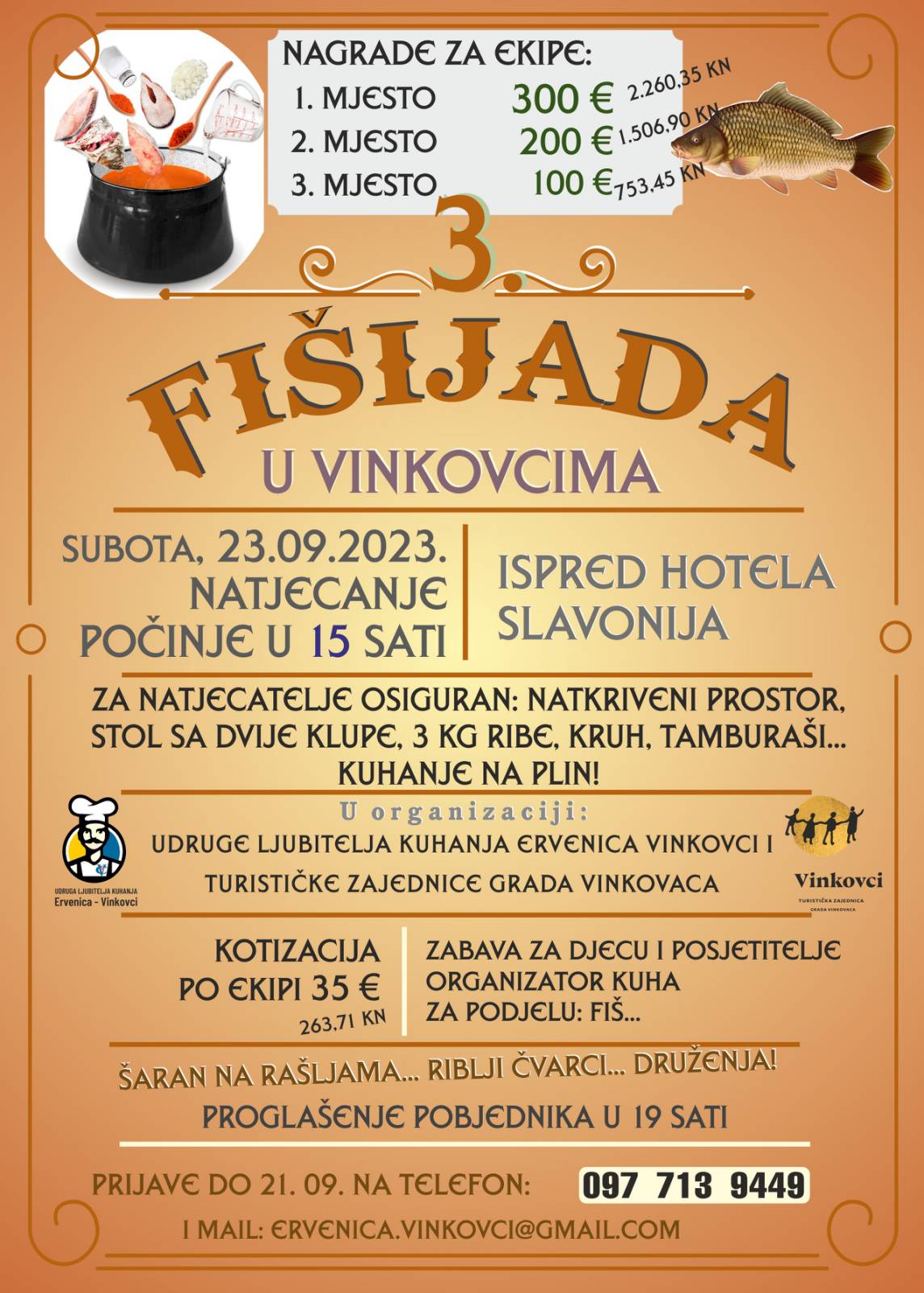 Treću godinu zaredom Udruga ljubitelja kuhanja Ervenica u suradnji s Turističkom zajednicom grada Vinkovaca organizira vinkovačku fišijadu. Već tradicionalno, majstori fiša okupit će se ispred hotela Slavonija i pokušati dokazati kako je upravo njihov fiš najbolji.