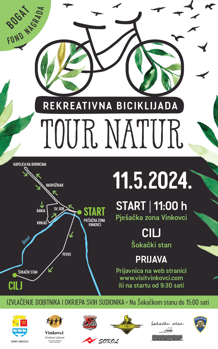 Turistička zajednica grada Vinkovaca poziva vas da se prijavite na rekreativnu biciklijadu “Tour natur” gdje vam i ove godine nudimo laganu vožnju, uživanje u krajoliku, ugodno društvo i naravno pregršt nagrada.