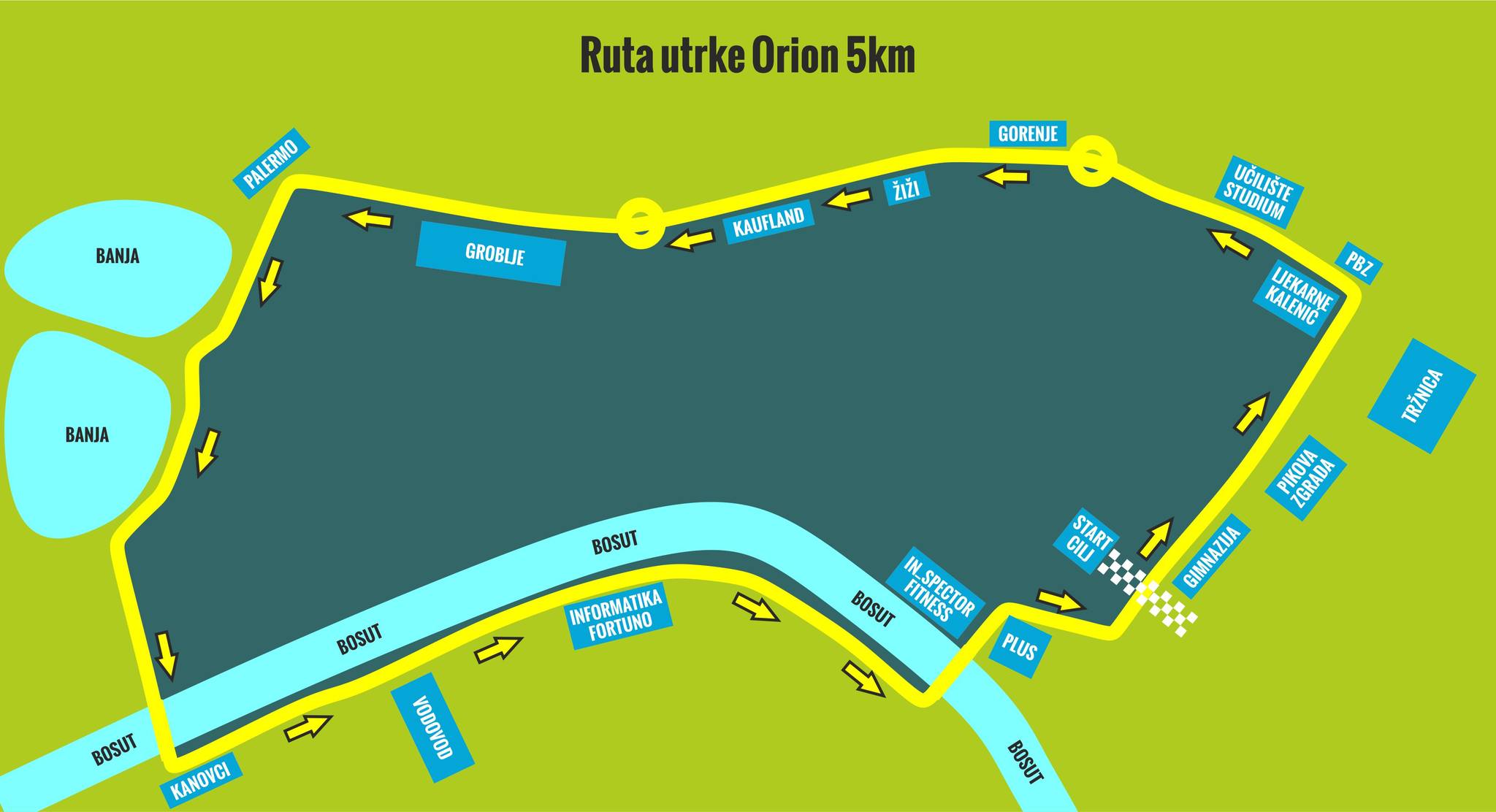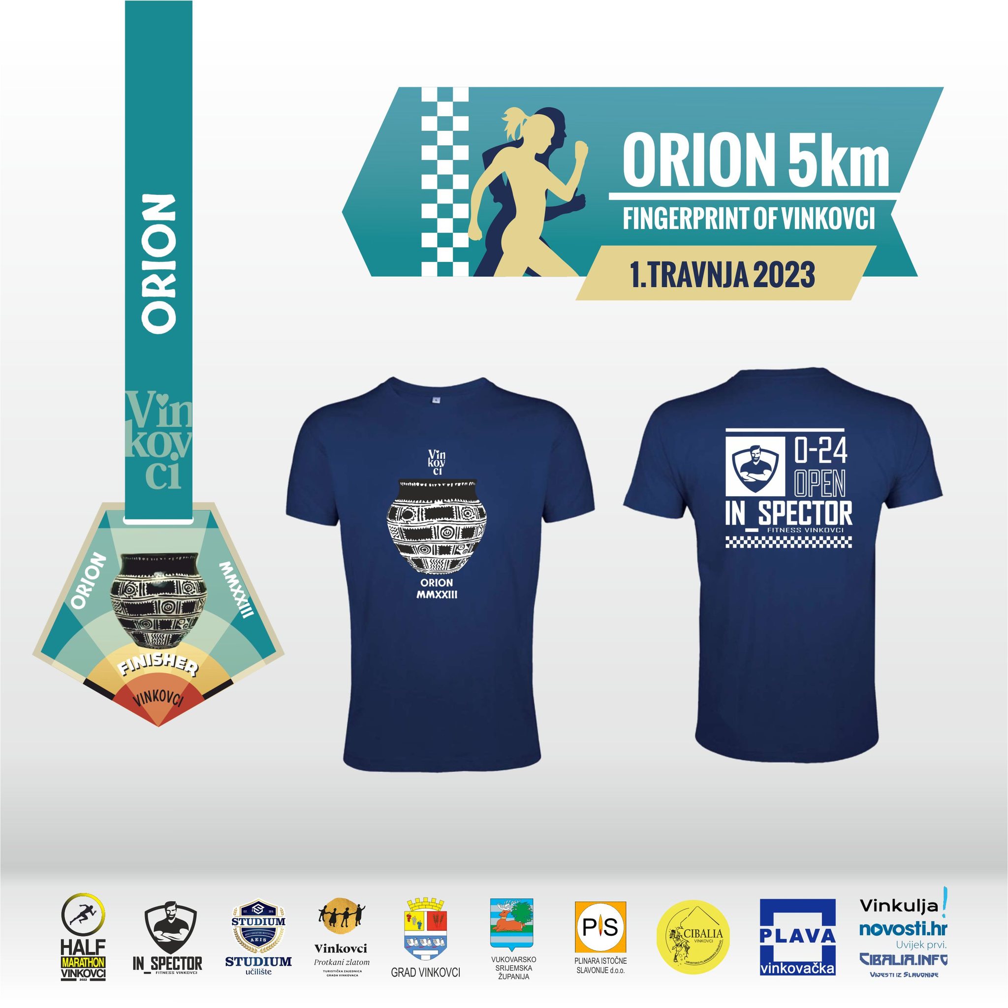 Utrka ORION 5km započinje 1. travnja u 16:00 sati na pješačkoj zoni na Trgu bana J. Šokčevića te se pješačkom zonom trči do Ulice kralja Zvonimira, Ulicom kralja Zvonimira do Ulice Ljudevita Gaja, iz Ulice Ljudevita Gaja prelazi se u Lapovačku ulicu kojom se trči do kružnog toka preko kojeg se ulazi u Ulicu A. Kačića Miošića. Kačić Miošićevom se trči do Grobljanske nakon koje se nastavlja šetnicom uz jezero Banja nakon koje se ulazi u Ulicu Dirov brijeg kojom se trči do Ulice Josipa Kozarca koju se pretrčava te se prelazi pješački most na rijeci Bosut. Nakon prelaska Bosuta trči se šetnicom u ulici Dragurina Žanića Karle sve do Ulice H. D. Genschera kojom se trči do Duge ulice i dalje cestom prema pješačkoj zoni na Trgu bana J. Šokčevića na kojoj se nalazi cilj.